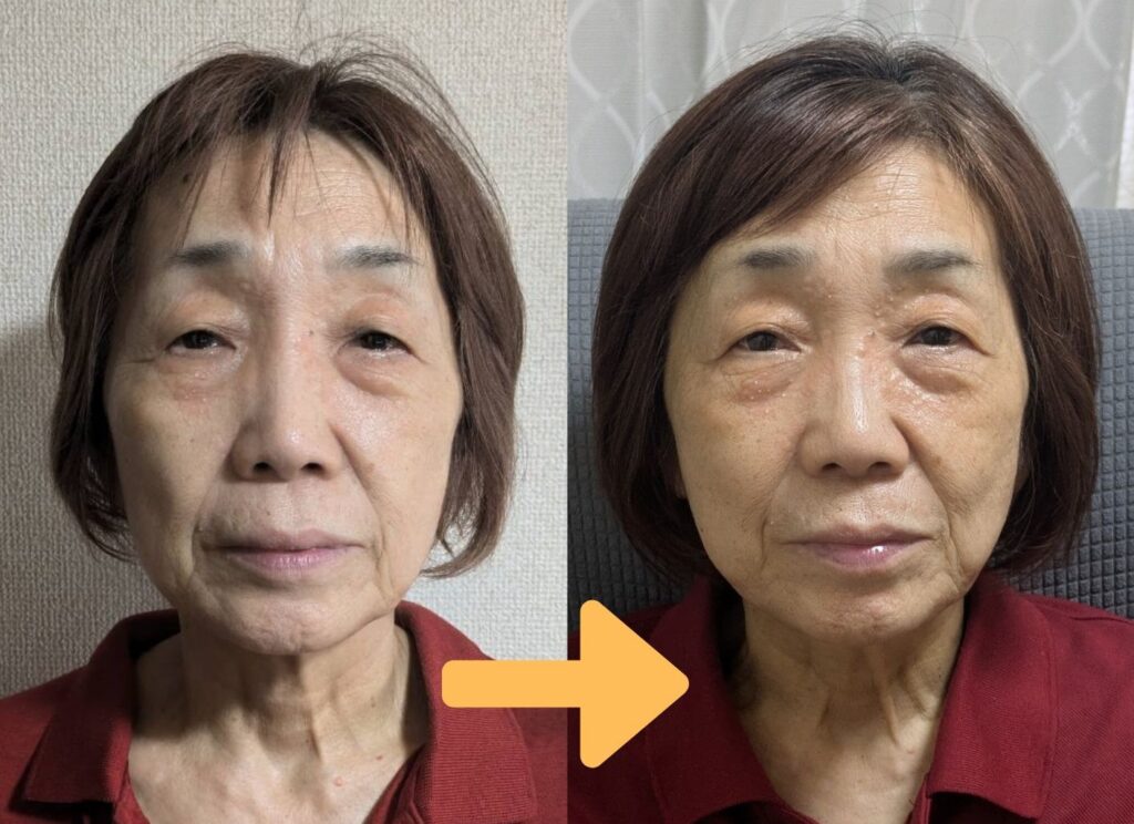 毎月1回施術をされ、顔全体の肌にツヤと目元にハリが出て健康的な肌がもどってきた。瞼が落ちてきて視界が狭くなっていた悩みも少しずつ解消され、最近ではノーファンデで出歩くことも多くなった。
